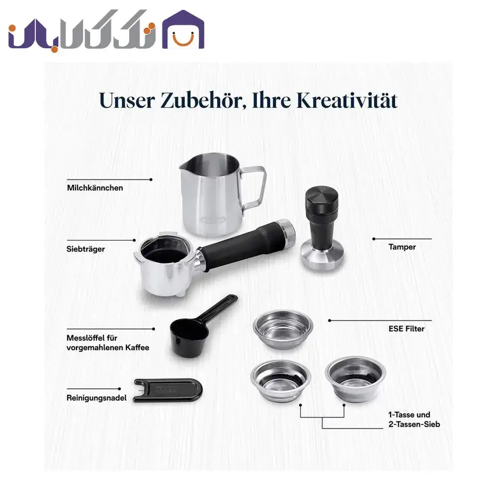 - دلونگی امکان استفاده از پودر قهوه و پد قهوه را فراهم کرده است. همچنین، به همراه دستگاه تمپر حرفهای و سبد فیلتر قرار دارد.